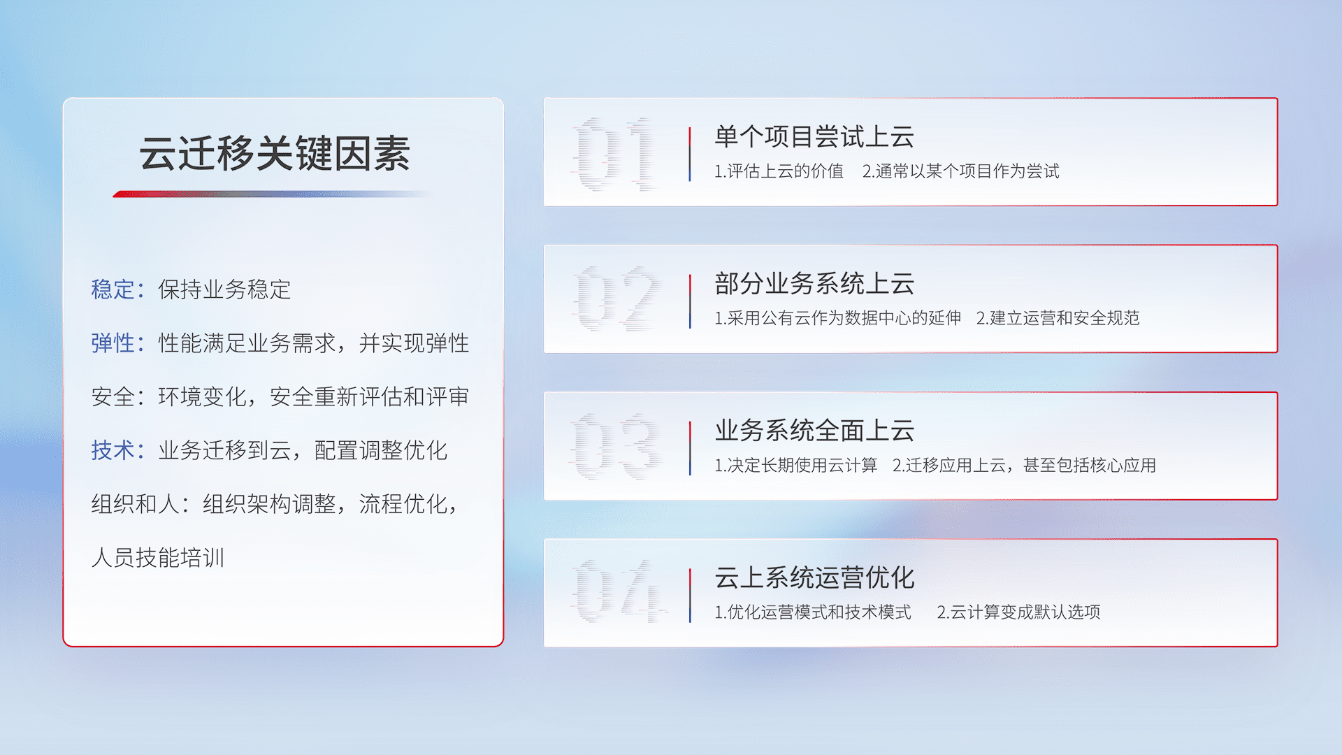结合实际业务,,,,从规划设计、、、云平台选型、、、云原生改造、、、数据迁移、、集成交付,,,迁移全过程为客户识别最佳上云路径,,,,做好风险识别管理,,,,设计网络架构、、、身份权限、、、、安全审计合规、、、、操作审计、、、日志审计、、监控告警策略、、、、多站点容灾设计等,,对云上基础设施进行整体规划,,,提升IT治理水平,,以满足弹性、、、高可用、、高性能的需求。。。。