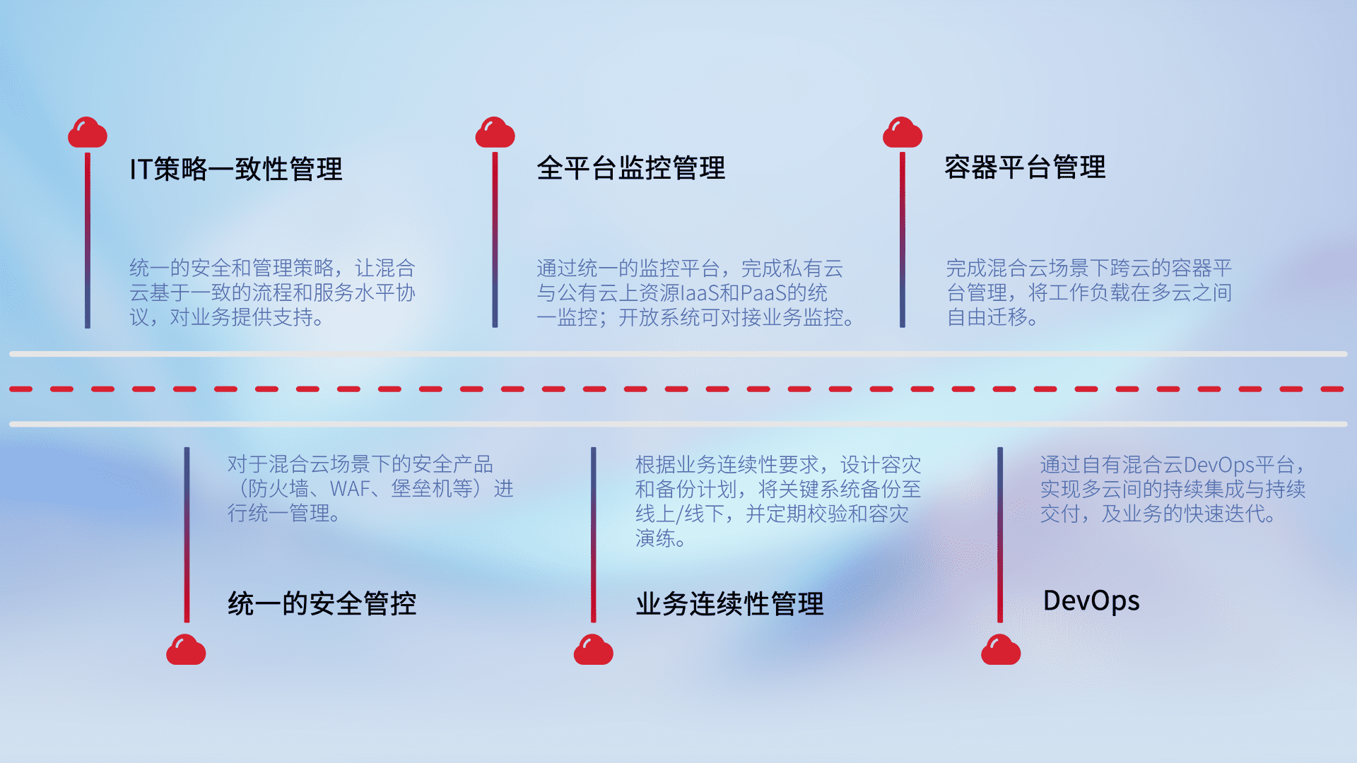 通过多云纳管,,以统一的资源数据模型把客户的云资源进行抽象和封装,,,,进而实现对多云资源的统一操作,,,保障云资源管理的可靠性、、、、稳定性与可用性。。。量身定制化运维内容,,配置、、、开发运维、、、、补丁管理、、、、备份、、、监控、、认证和访问管理、、审计和日常巡检等,,,,保障在用云过程中的可靠度,,,,稳定度以及高可用率。。